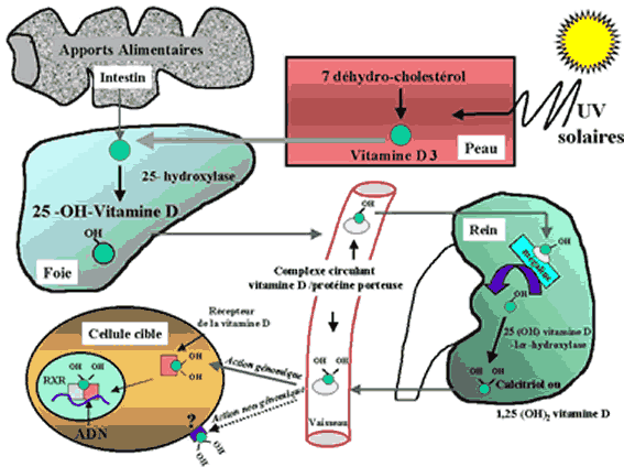 La vitamine D est absorbée dans l’organisme sous deux formes : la vitamine D2, dont l’apport provient essentiellement de l’alimentation, et la vitamine D3, synthétisée notamment par la peau sous l’action des ultraviolets. Elle est métabolisée, sous l’une ou l’autre forme, par le foie, où une première hydroxylation la transforme en calcidiol. Le taux de calcidiol peut être utilisé pour évaluer la présence de vitamine D dans l’organisme. La deuxième hydroxylation, effectuée dans le rein sous l’effet de l’enzyme 1-α-hydroxylase et régulée par l’hormone parathyroïdienne et les œstrogènes, produit le calcitriol, dont le rôle est analogue à celui d’une hormone stéroïdienne. Une carence en vitamine D entraîne l’apparition d’un complexe de symptômes comprenant des troubles divers.